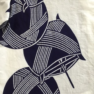デッドストックの浴衣の反物から作りました。大胆でリズミカルな糸巻の柄が目を引き、個性的です。デッドストックの反物でしたので、微かな薄汚れがあります。そのために、価格をお安く設定しました。あまり目立ちませんが、気になさる方はご購入をお控えください。