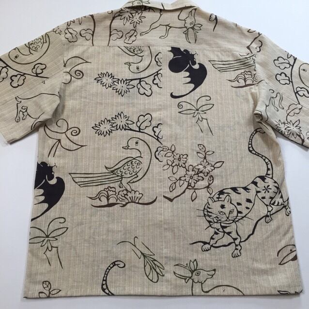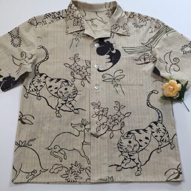 浴衣の反物から作りました。大胆でありながら可愛らしさも感じる柄です。濃いベージュというお色のせいか、意外と落ち着いた印象で、どなたでも着こなせるかと思います。凹凸のある変わり織りで肌にべとつかず、気持ちよくお召しになれます。